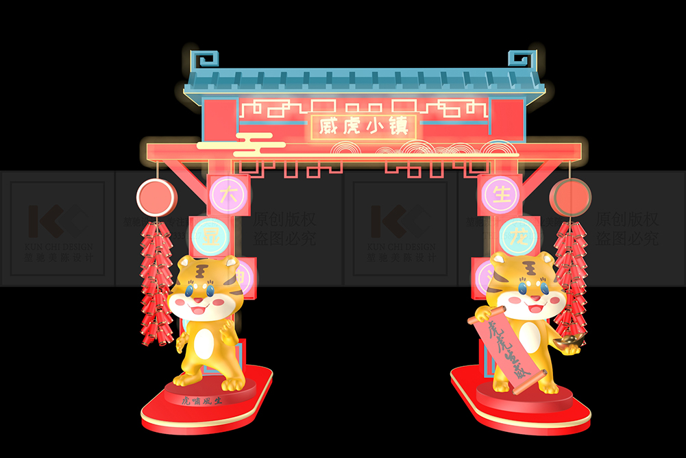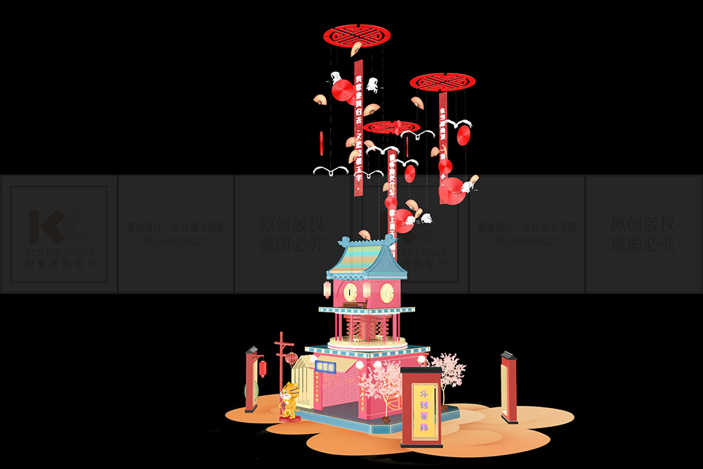 設(shè)計說明:該方案是以春節(jié)為主題。結(jié)合“虎年”形象IP和中國國潮元素相配合,給人以傳統(tǒng)與時尚相結(jié)合的氛圍。燈光色系比較簡潔,主體為中庭摘星閣,以高高在上傳統(tǒng)廟宇的形式來展現(xiàn)空中樓閣的氛圍,引入“天圓地方”天空之上的概念,與地面彩云形成對比,來豐富主體的細(xì)節(jié)。兩側(cè)分別為星愿坊,和國潮鼓,一邊讓我們感受濃郁的新年中國風(fēng)的國潮氛圍,另一邊可以形成互動,給每一位朋友祈愿,放飛屬于自己的心愿燈!