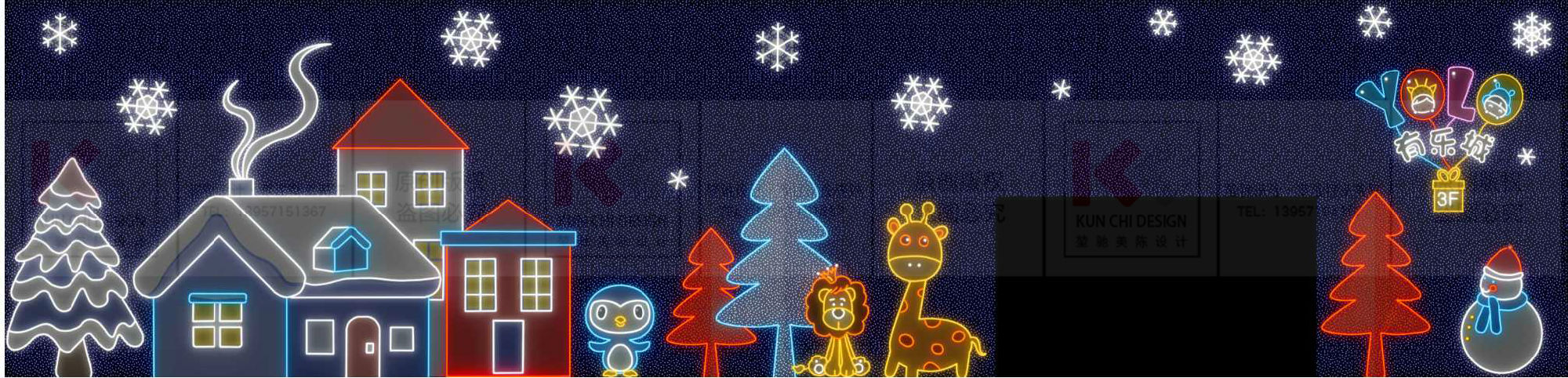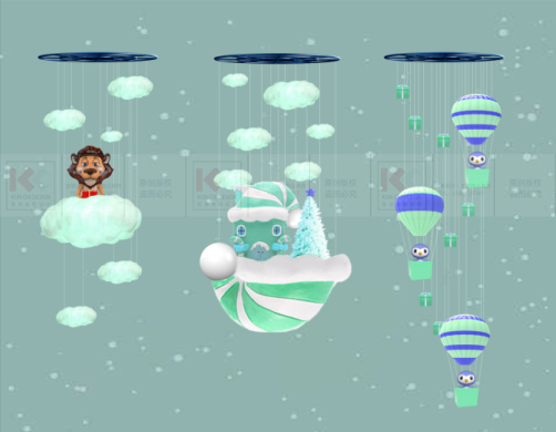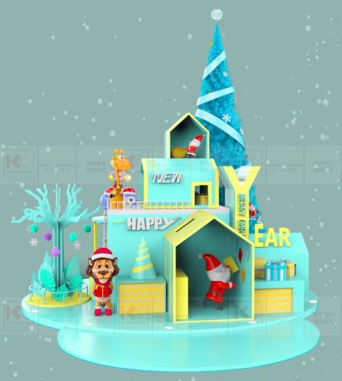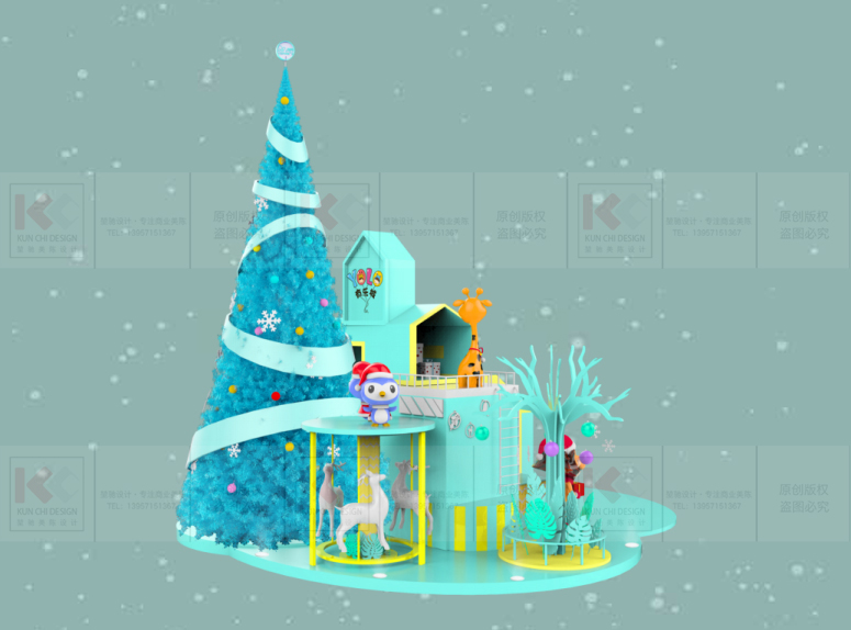 造夢拾光 · 藍至沓來是以圣誕老人的傳統(tǒng)元素為主并結合北歐童話樹屋對中 庭進行設計。整體配色偏網(wǎng)紅風格,讓潮流和傳統(tǒng)元素進行碰撞,給所有人一個 耳目一新的圣誕購物體驗。整體設計上結合了美陳表現(xiàn)方法展現(xiàn)圣誕老人幾個生 活化場景,營造一個溫馨浪漫的氛圍,從而引起顧客對童年幻想的情感共鳴,達 到刺激消費的目的。還可以讓顧客在多維度內(nèi)去感受商場的魅力,從而達到對商 場宣傳效果的傳播,提升顧客的購物體驗和粘性。